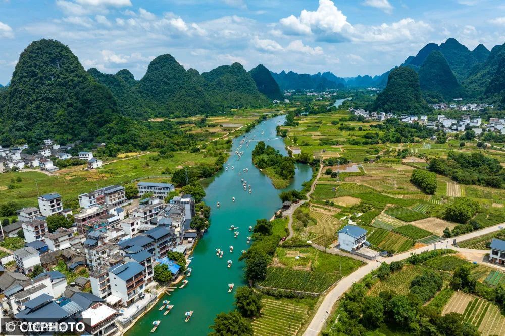 市阳朔县遇龙河漂流。(无人机照片)CICPHOTO/黄胜林 摄