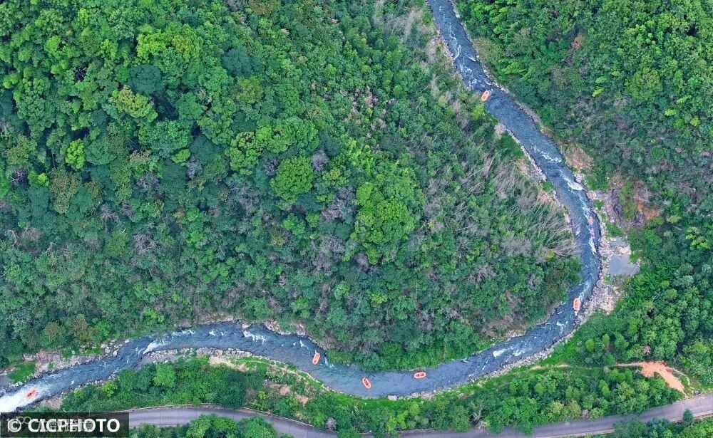 ↑2024年7月20日,游客在湖南省常宁市塔山瑶族乡西江漂流景区漂流。CICPHOTO/刘东华 摄