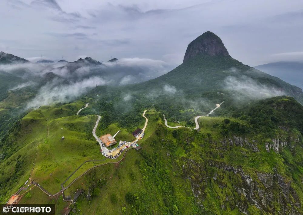 ↑2024年7月28日,位于广西岑溪市南渡镇吉太村的天龙顶山地公园晨雾缭绕。(无人机照片)CICPHOTO/黄胜林 摄