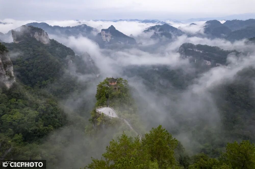 ↑2024年7月28日,位于广西岑溪市南渡镇吉太村的天龙顶山地公园晨雾缭绕。(无人机照片)CICPHOTO/何华文 摄