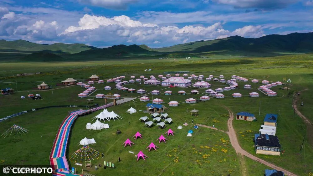 藏族自治州碌曲县尕海镇尕秀村,游客在帐篷城景区游玩。CICPHOTO/陈坤 摄