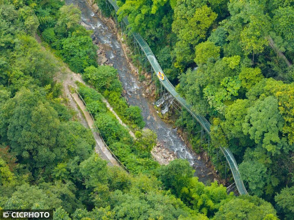 ↑2024年7月28日,游客在四川省华蓥市华蓥山黑龙峡旅游景区游玩。(无人机照片)CICPHOTO/张波 摄