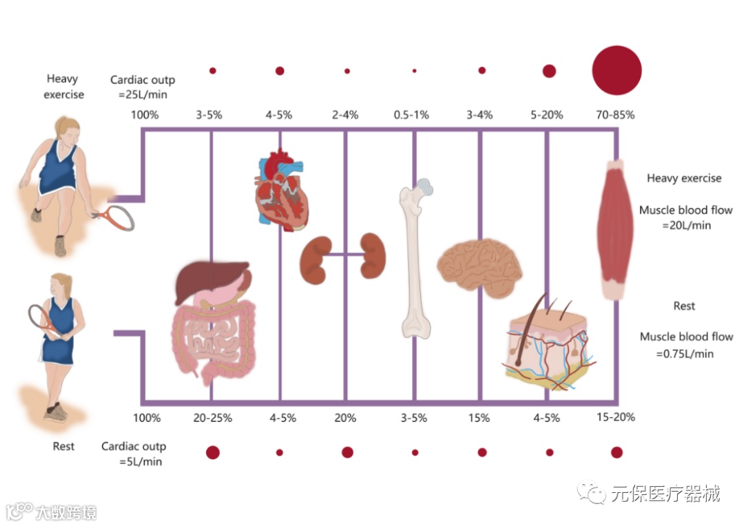 静息状态及高强度运动中的血流分布情况改变