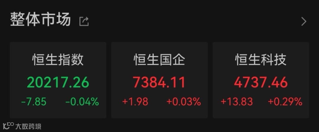 港股市场一度受到拖累,三大股指开盘后集体下跌,恒生指数、国企指数上午一度跌超2%,恒生科技指数一度跌超3%。午后,恒生中国企业指数、恒生科技指数尾盘强势转涨。Wind数据显示,截至收盘,港股恒生指数跌0.04%,报20217.26点;恒生中国企业指数涨0.03%,报7384.11点;恒生科技指数上涨0.29%,报4737.46点。