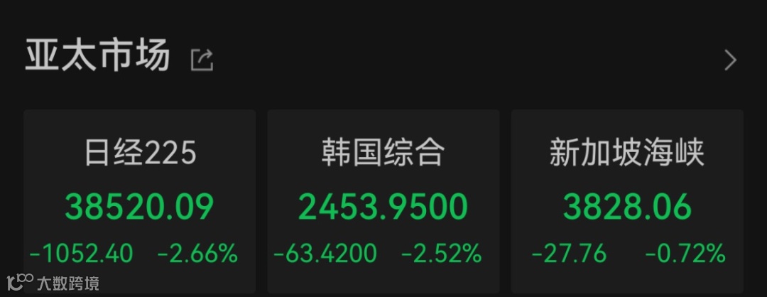 2月3日,亚太股市主要股指下跌。Wind数据显示,日经225指数下跌2.66%。住友制药、科乐美集团、ALPS ALPINE涨幅居前;SOCIONEXT、日本火腿、精工爱普生跌幅居前。韩国综合指数下跌2.52%,盘中最大跌幅超过3%。
