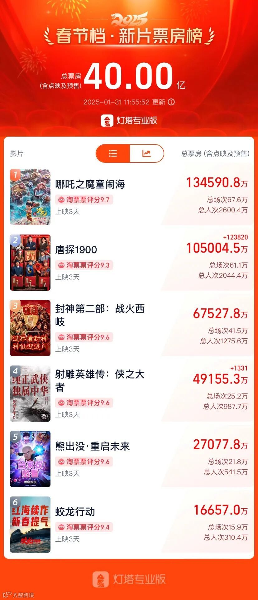 网络平台数据显示,截至1月31日11时55分,2025春节档总票房(含预售)破40亿元。《哪吒之魔童闹海》《唐探1900》《封神第二部:战火西岐》分列春节档票房榜前三位。