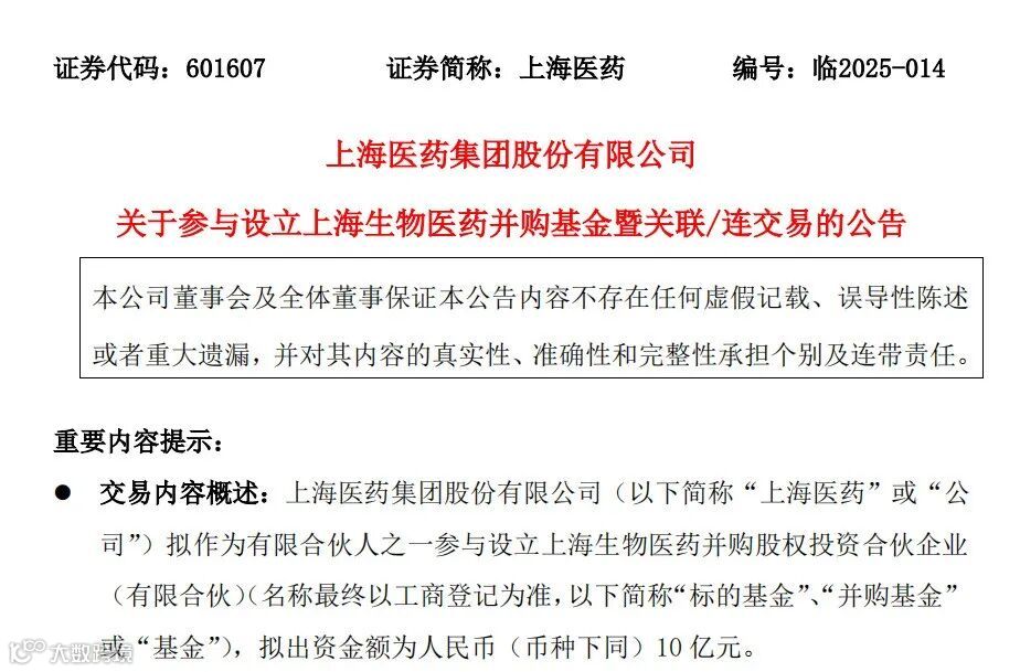 谈及此次参与设立并购基金的目的,上海医药表示,公司作为上海市生物医药行业优质“链主”企业,参与组建设立生物医药并购基金,对上海市生物医药产业及上海医药未来的高