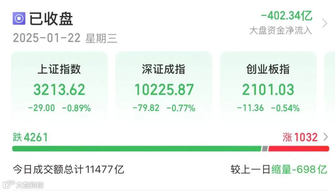 今日,A股三大指数全部收跌。截至收盘,沪指跌0.89%、深证成指跌0.77%、创业板指跌0.54%。市场全日成交11477亿元,较前一交易日减少698亿元。