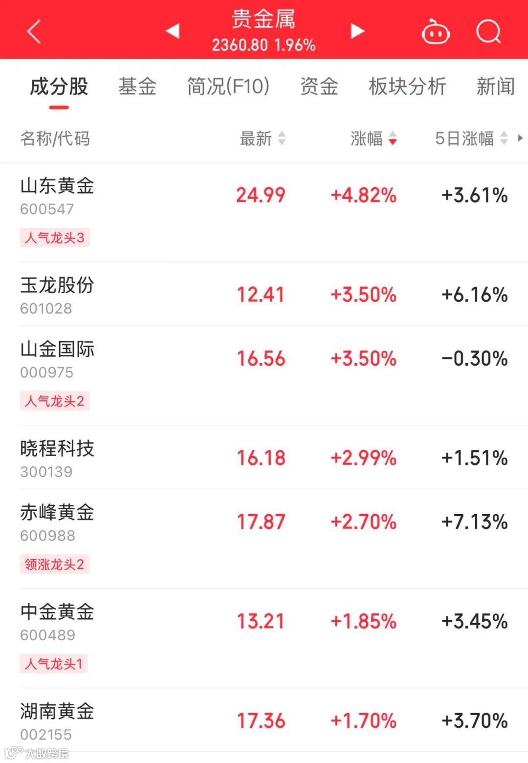 下午开盘,贵金属板块突然强势拉升。截至收盘,山东黄金涨4.82%,玉龙股份、山金国际等跟涨。
