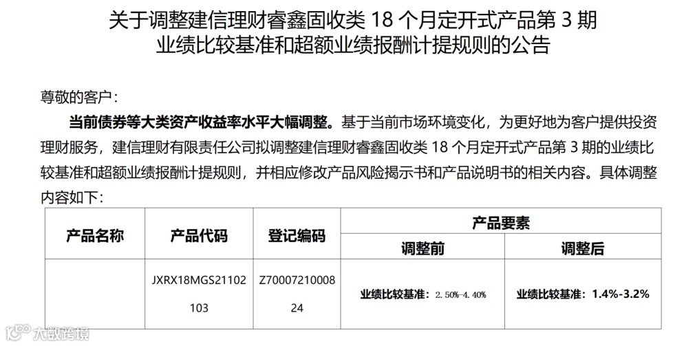 例如,1月26日建信理财发布公告称拟调整建信理财睿鑫固收类18个月定开式产品第3期的业绩比较基准和超额业绩报酬计提规则,将该产品的业绩比较基准由2.5%-4.4%下调至1.4%-3.2%。调整自2月17日开始,于下一运作周期(含)起生效。若客户不同意本次调整,可2月10日9:00至2月17日17:00提出赎回申请。