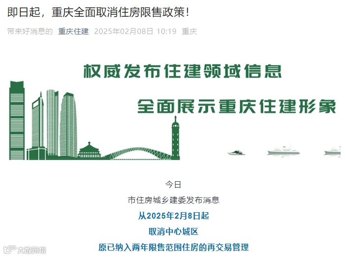 2月8日,重庆市住建委发布消息,即日起取消中心城区原已纳入两年限售范围住房的再交易管理。这就意味着,重庆全面取消住房限售政策。