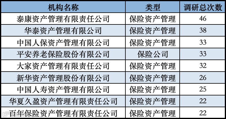 从险资调研频率来看,泰康资产参与调研次数最多,今年以来共调研上市公司46次,合计调研43只个股。此外,华泰资产、人保资产、平安养老、大家资产今年以来调研次数均超过30次。