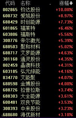 今天上午,新能源赛道反弹,BC电池、光伏设备等板块大涨,钧达股份、爱旭股份等个股涨幅居前。