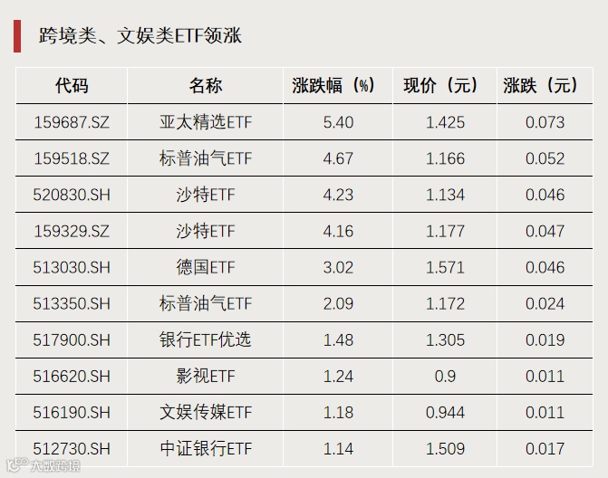 跨境类、文娱类ETF领涨