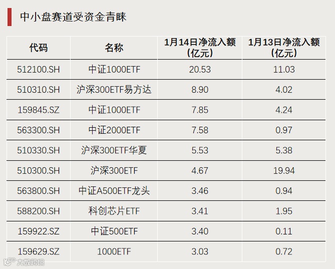 记者梳理发现,在1月14日单日净流入额最高的前十只ETF中,出现了三只中证1000ETF、一只中证2000ETF。这说明,不少资金在昨日选择流入中小盘赛道。在1月13日净流入额最高的前十只ETF中,仅有两只中证1000ETF的身影。