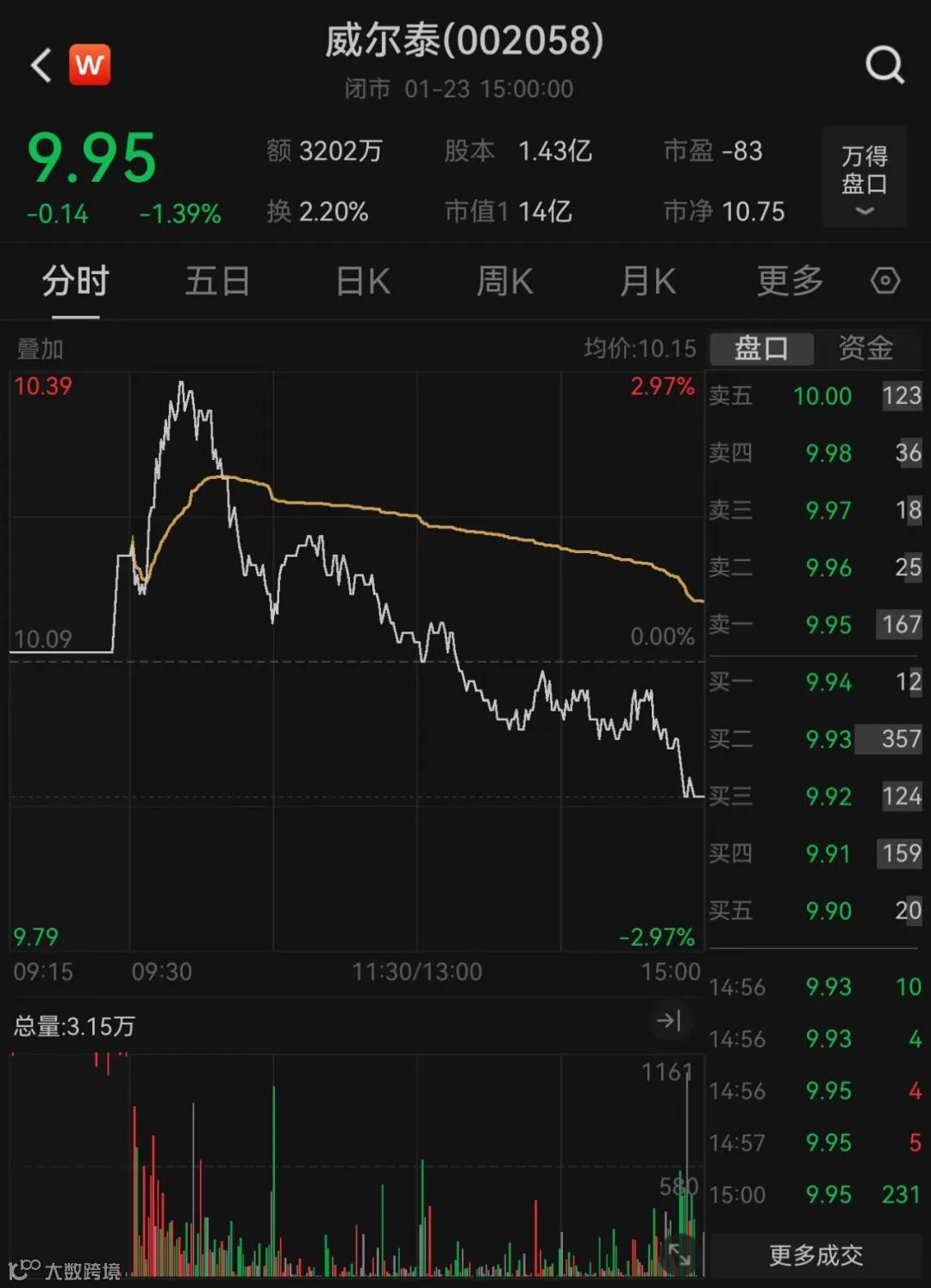 Wind数据显示,截至1月23日,威尔泰收报9.95元/股,跌1.39%,市值14亿元。