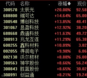 午后A股走势有两个关键时间点:13:20左右,算力硬件股涨势扩大,太辰光快速拉升,创历史新高,板块内多股涨超10%;14:00左右,芯片股显著走强,“AI芯片第一股”寒武纪尾盘涨超10%,创历史新高。