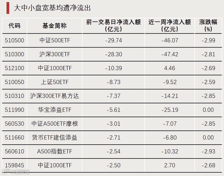 前一交易日,净流出居前的ETF多为权益类资产,居全市场前十的基金中,有8只为宽基指数ETF,覆盖大中小盘等多类型宽基,单日合计净流出超90亿元,占近一周累计净流出额的比例超过70%。其中不乏