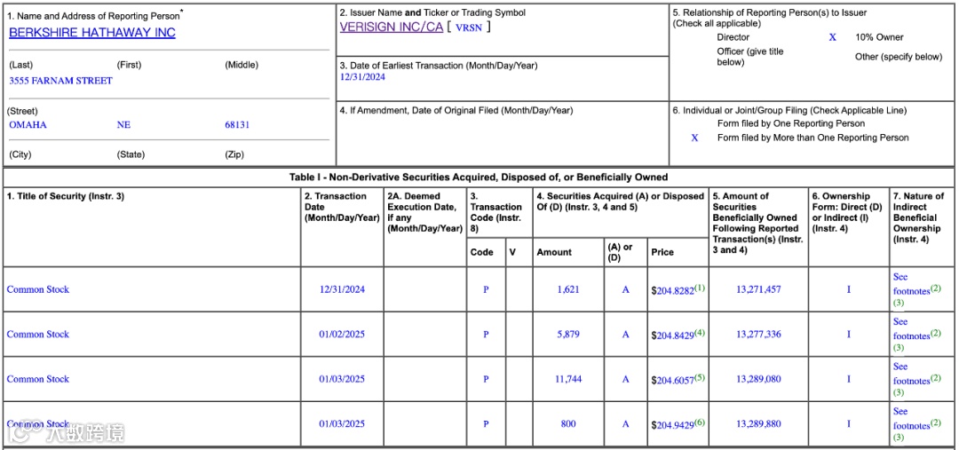 伯克希尔向美国证券交易委员会(SEC)最新提交的文件显示,其在2024年12月31日至2025年1月3日买入了约2万股威瑞信(VeriSign)普通股,总金额约410万美元,约合人民币3000万元。