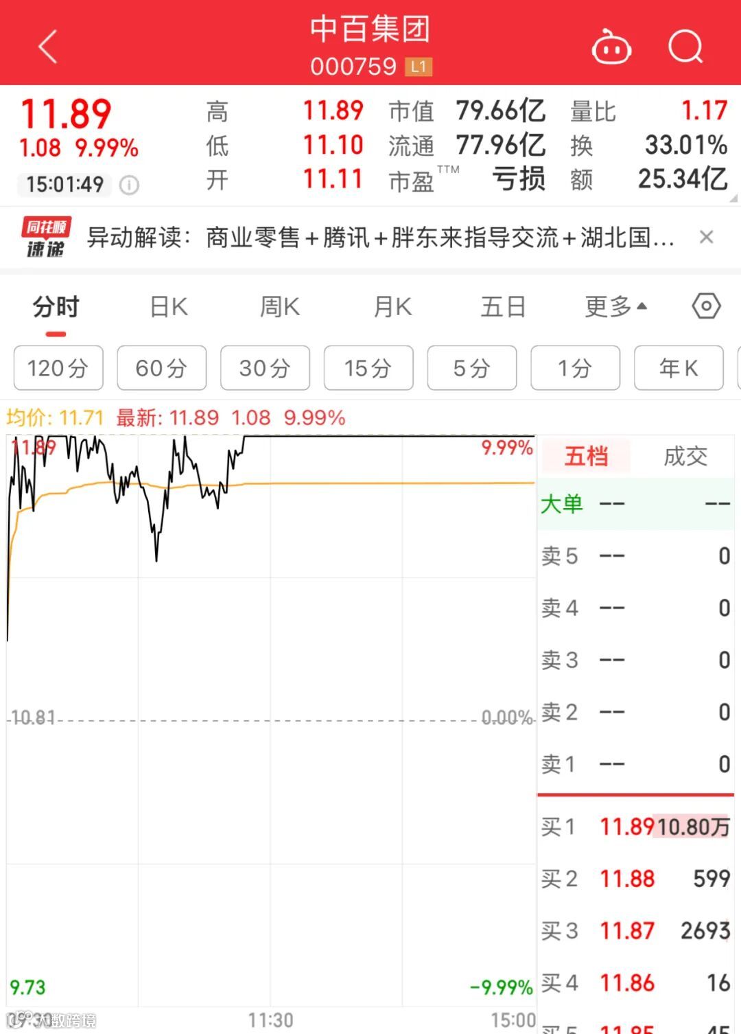 中百集团(000759)今日再度涨停,16个交易日收获11个涨停板。该股今日收报11.89元/股,
