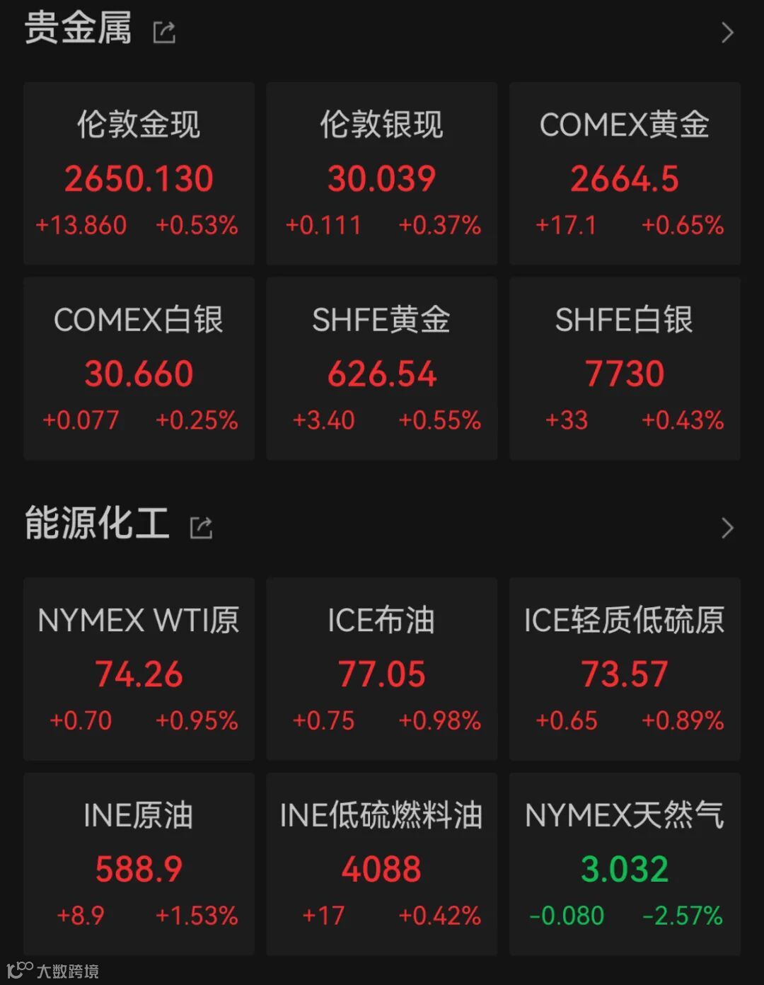 大宗商品方面,国际金银价格和国际石油价格全线上涨。