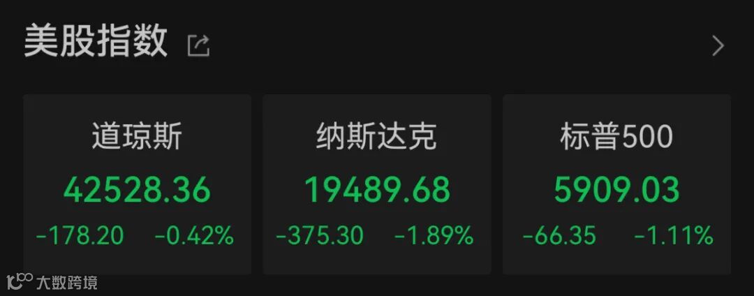 当地时间周二,美国三大股指全线收跌。截至收盘,道指跌0.42%,标普500指数跌1.11%,纳指跌1.89%。