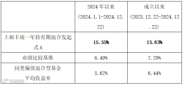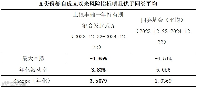 注①:上银丰瑞一年持有期混合发起式A累计净值增长率、同期业绩比较基准数据来源于Wind,已经托管行复核,截至2024年12月22日。上银丰瑞一年持有期混合发起式成立于2023年12月22日,其业绩比较基准为中债-综合全价指数收益率×85%+沪深300指数收益率×15%,A类份额成立以来至2024年12月22日收益率/业绩比较基准收益率为15.63%/7.29%,C类份额成立以来至2024年12月22日收益率/业绩比较基准收益率为15.30%/7.29%。现任基金经理任职情况:赵治烨2023年12月22日至今,许佳2023年12月22日至今。以上业绩数据已经托管行复核。基金的过往业绩及其净值高低并不预示其未来业绩表现,基金管理人管理的其他基金的业绩并不构成对基金业绩表现的保证。最大回撤、年化波动率、Sharpe(年化)、同类基金平均收益率数据均来源于Wind,统计区间为2023.12.22-2024.12.22。同类基金为开放式基金-偏债混合型基金,分类基于Wind。Sharpe计算公式为(平均收益率-无风险收益率)/收益率标准差,年化Sharpe计算周期为周,无风险收益率为一年定存利率(税前)。Sharpe值越高,投资组合性价比越佳。以上最大回撤、年化波动率、 Sharpe(年化)仅为过往历史数据分析,并不代表本基金未来表现。