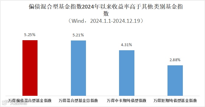 作为股债兼备的代表性产品,“固收+”基金在2024年的热度屡屡霸榜,而此类型产品的表现也确实不负众望,截至2024年12月19日,固收+基金代表指数——万得偏债混合型基金指数全年收益率5.25%,高于万得混合型基金总指数,也远高于万得中长期纯债型指数及短期纯债型基金指数。