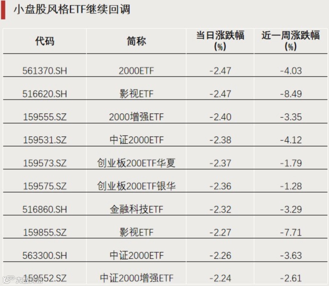 随着大小盘股走势显著分化,今日,小盘股风格ETF继续下探。中证2000、影视、金融科技等相关ETF跌幅超过2%。