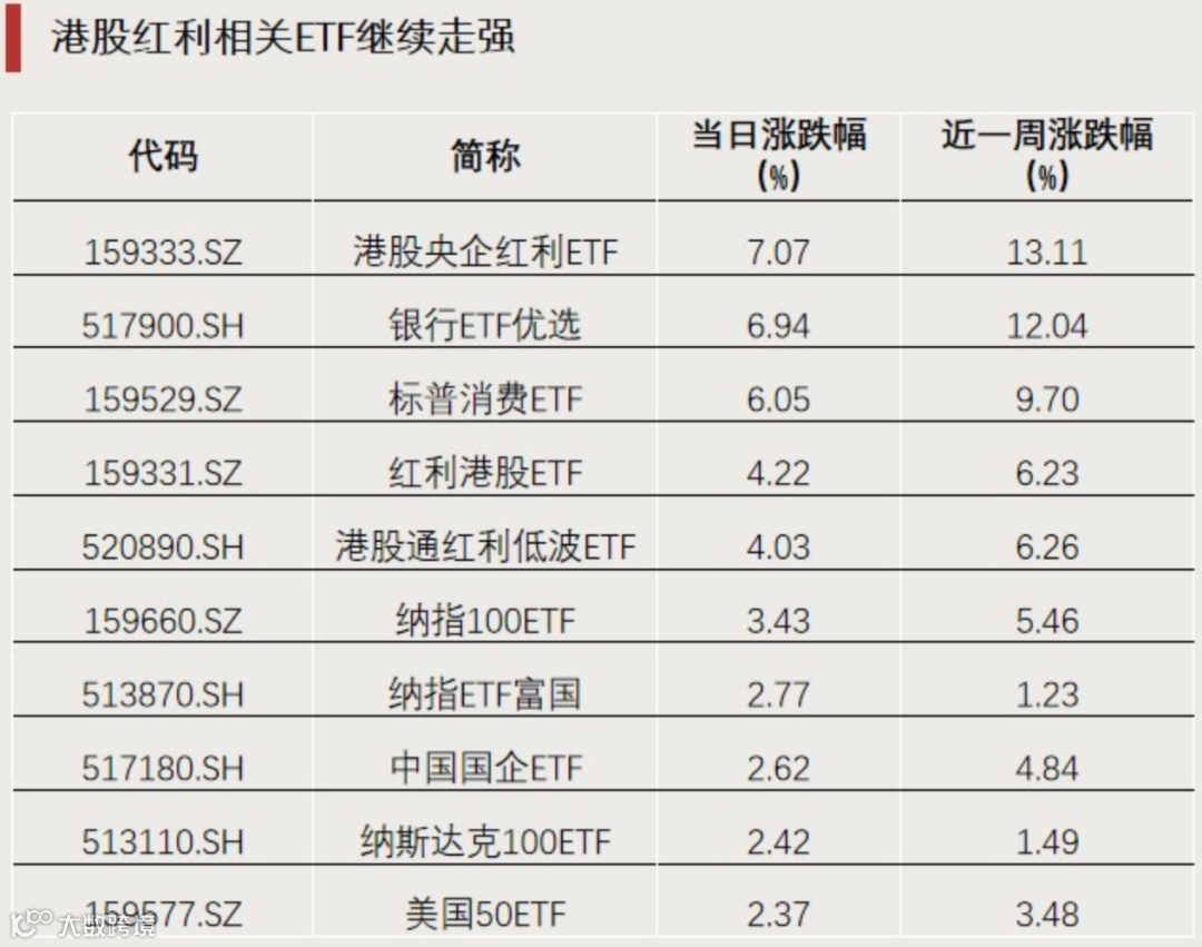 12月25日,A股缩量调整,市场多数板块下跌,大盘股和红利风格继续走强。今日港股休市,内资却涌向港股红利ETF,港股央企红利ETF(159333)成交额接近昨日的5倍,位居涨幅榜前列。此外,银行类ETF产品在盘中一度触及涨停。