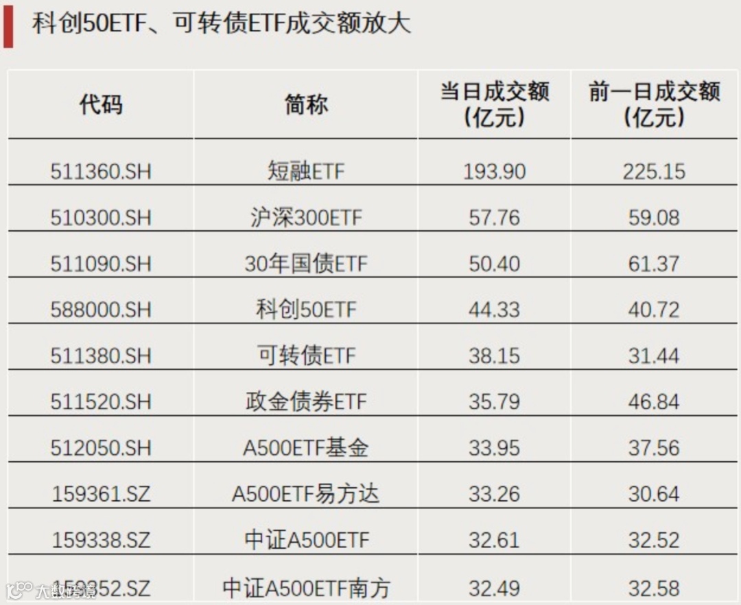 今日,全市场成交额进一步缩量。在成交额居前的ETF产品中,沪深300ETF、科创50ETF、债券类ETF交易活跃。其中,科创50ETF(588000)、可转债ETF(511380)今日成交额较昨日有所提升。