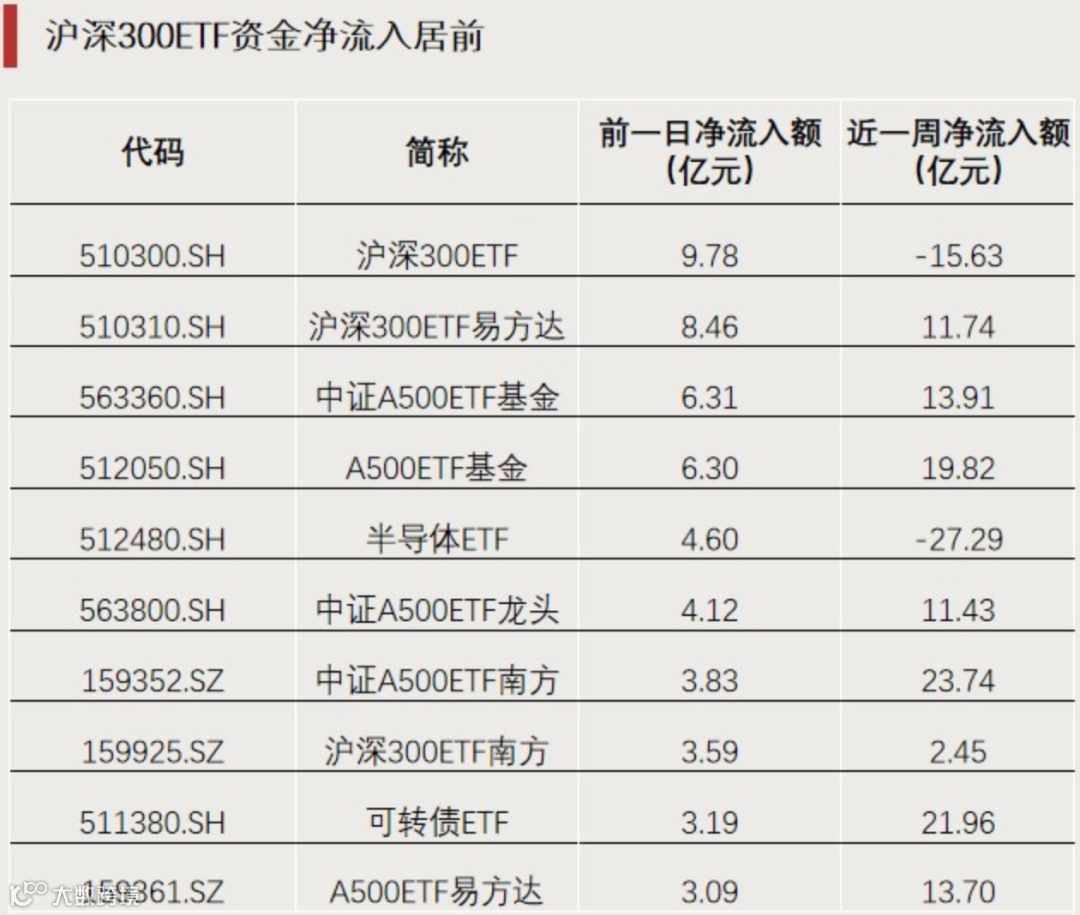 数据显示,全市场股票型ETF在本周一和周二连续两日资金净流入,周一在中小盘股下跌之际,有“抄底”资金越跌越买;周二净流入较大的有多只沪深300ETF和多只中证A500相关ETF,此外还有半导体ETF(512480)等产品。