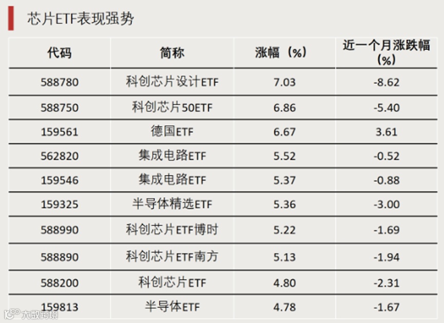 1月7日,芯片、集成电路、半导体等相关ETF涨幅居前,科创芯片设计ETF当日涨幅为7.03%,科创芯片50ETF、德国ETF涨超6%。