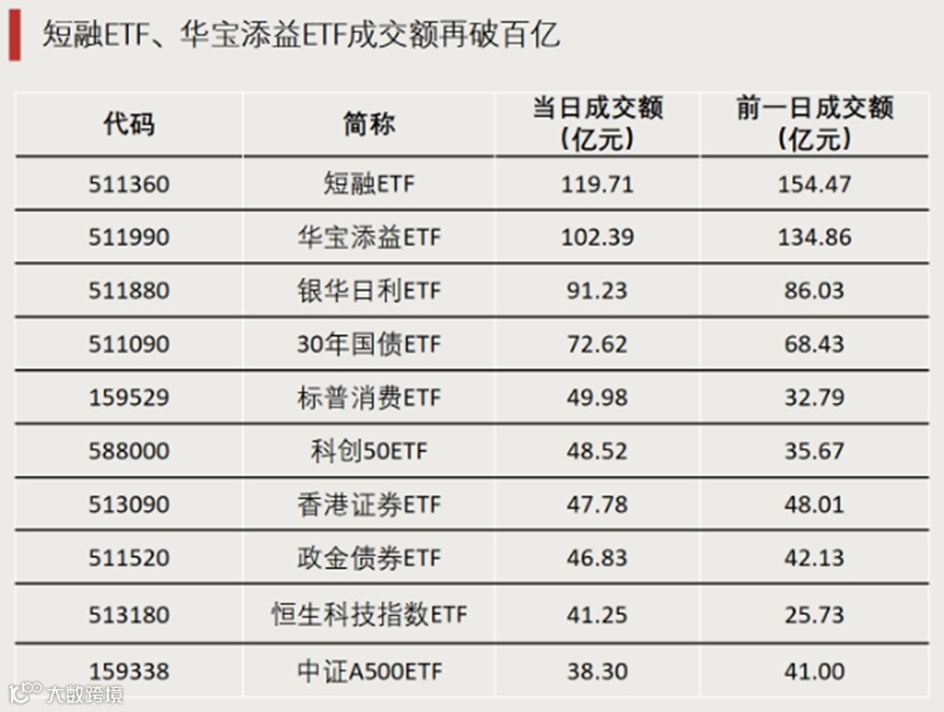 1月7日,成交额居前的ETF中,债券ETF和货币ETF居多,其中短融ETF和华宝添益ETF日成交额再次突破百亿元。股票型ETF中,科创50ETF、中证A500ETF两只宽基指数ETF有较高的成交额,香港证券ETF成交额也再度排名前列。