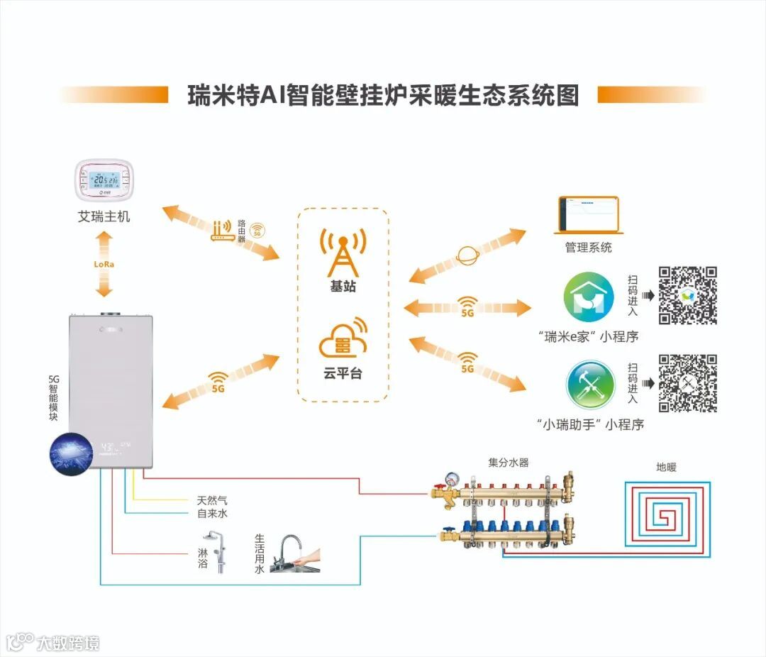 瑞米特AI智能壁挂炉系统包括瑞米特AI智能壁挂炉主机、艾瑞主机、瑞米e家小程序、小瑞助手和B/S综合管理系统,AI智能壁挂炉搭载着5G模块以及RF射频模块,可以不受Wi-Fi网络限制进行数据通讯,同时和艾瑞主机可以进行短距离无线通讯,艾瑞主机具备着Wi-Fi功能,通过Wi-Fi网络和云端进行数据交互,同时也搭载RF射频模块,可以根据房间温度和设定温度的比较,给壁挂炉发送供暖启停指令。