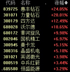 今天上午,培育钻石板块大涨,惠丰钻石、力量钻石、四方达等个股大涨。