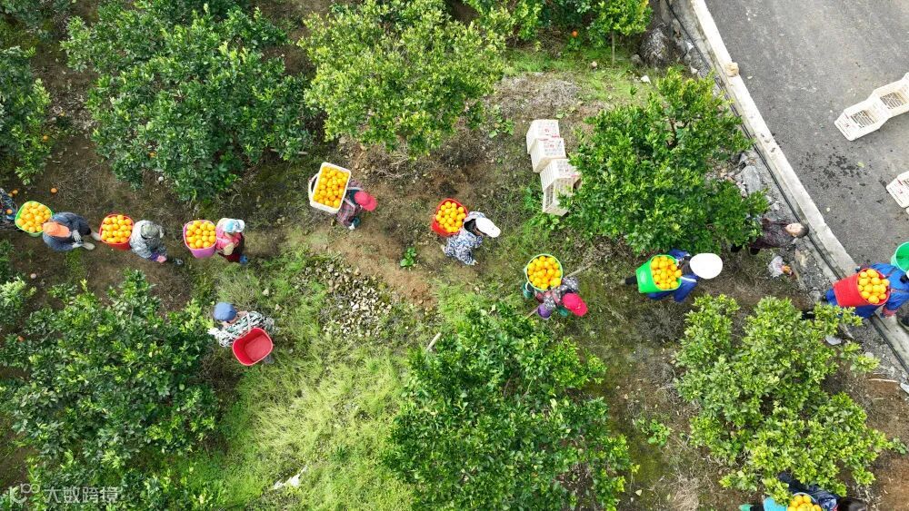 ↑2024年11月27日,果农在重庆市秀山土家族苗族自治县洪安镇脐橙基地转运脐橙。(无人机照片)CICPHOTO/胡程 摄