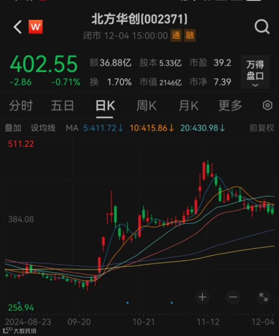 据Wind数据,截至12月4日收盘,北方华创股价为402.55元,最新总市值为2146亿元。