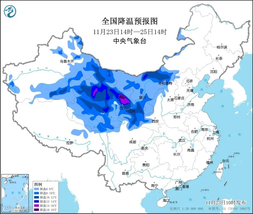 预计,11月23日14时至11月25日14时,新疆东部和南部、内蒙古西部和中部、青海、甘肃、宁夏、陕西西部和北部、山西北部、河北西北部等地将先后降温6~10℃