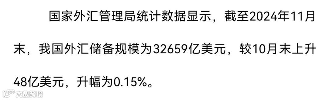 国家外汇管理局12月7日发布数据显示,截至2024年11月末,我国外汇储备规模为32659亿美元,较10月末上升48亿美元,升幅为0.15%。