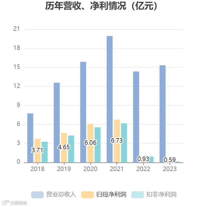 2023年,公司业绩仍出现下滑,全年实现营业收入15.33亿元,同比增长6.90%;归母净利润5897.25万元,同比下降36.28%;扣非净利润1055.51万元,同比下降88.45%。