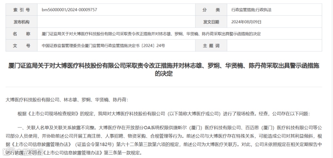 厦门证监局官网8月9日消息,厦门证监局决定对大博医疗科技股份有限公司采取责令改正措施并对林志雄、罗炯、华贤楠、陈丹荷采取出具警示函措施。