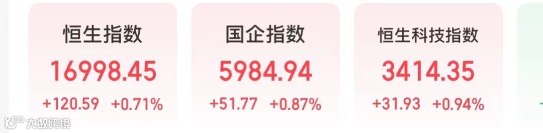 港股走势相同,早盘大跌,之后持续拉升。截至收盘,恒生指数上涨0.71%,国企指数上涨0.87%,恒生科技指数上涨0.94%。