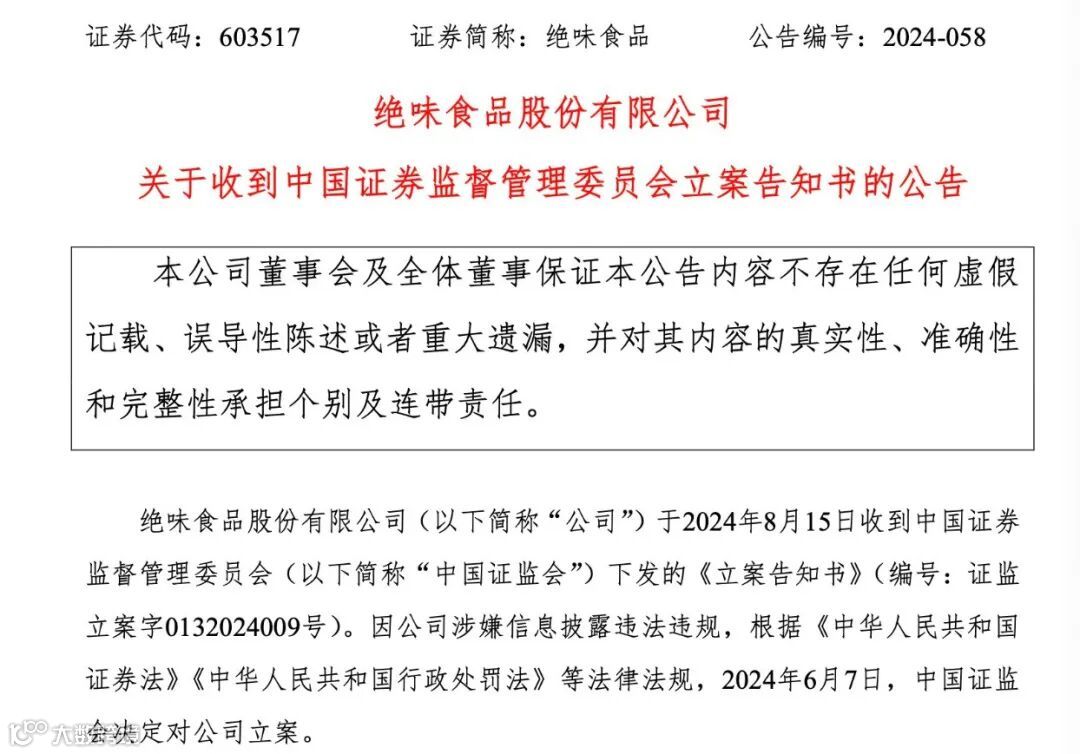 绝味食品公告称,公司收到中国证监会下发的《立案告知书》。因涉嫌信息披露违法违规,根据相关法律法规,2024年6月7日,中国证监会决定对公司立案。