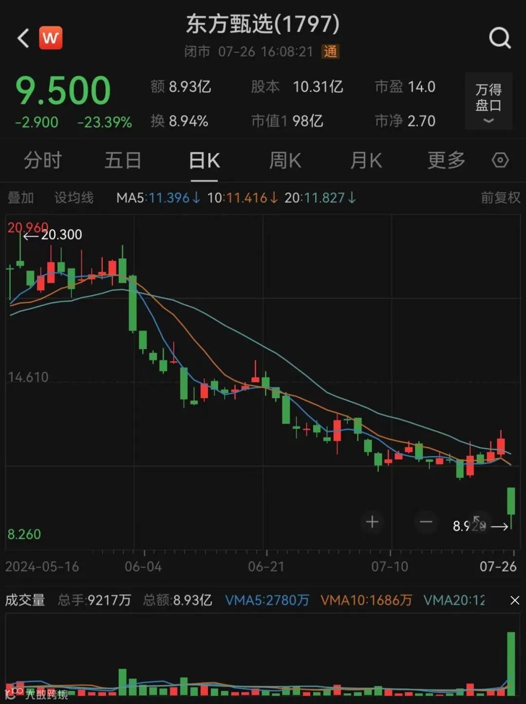 7月26日,东方甄选股价大跌,盘中一度大跌近30%。