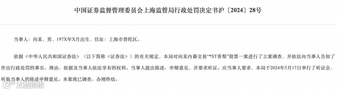 证监会网站日前披露的一则行政处罚决定书显示,上海证监局对人健药业董事会秘书兼副总经理向某内幕交易“*ST香梨”股票一案进行了立案调查,最终,上海证监局决定对向某内幕交易“*ST香梨”股票的行为,没收违法所得342.78万元,并处以685.56万元罚款。