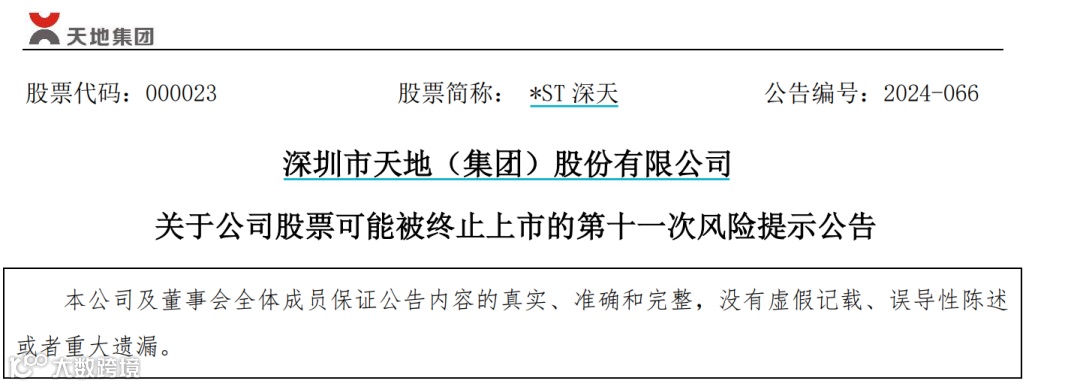 *ST深天表示,公司股票2024年6月27日至今已连续19个交易日收盘市值均低于3亿元,根据《深圳证券交易所股票上市规则(2024修订)》第9.2.4条相关规定,披露本次风险提示公告。若公司股票收盘总市值连续二十个交易日低于3亿元,公司股票将存在被终止上市的风险。