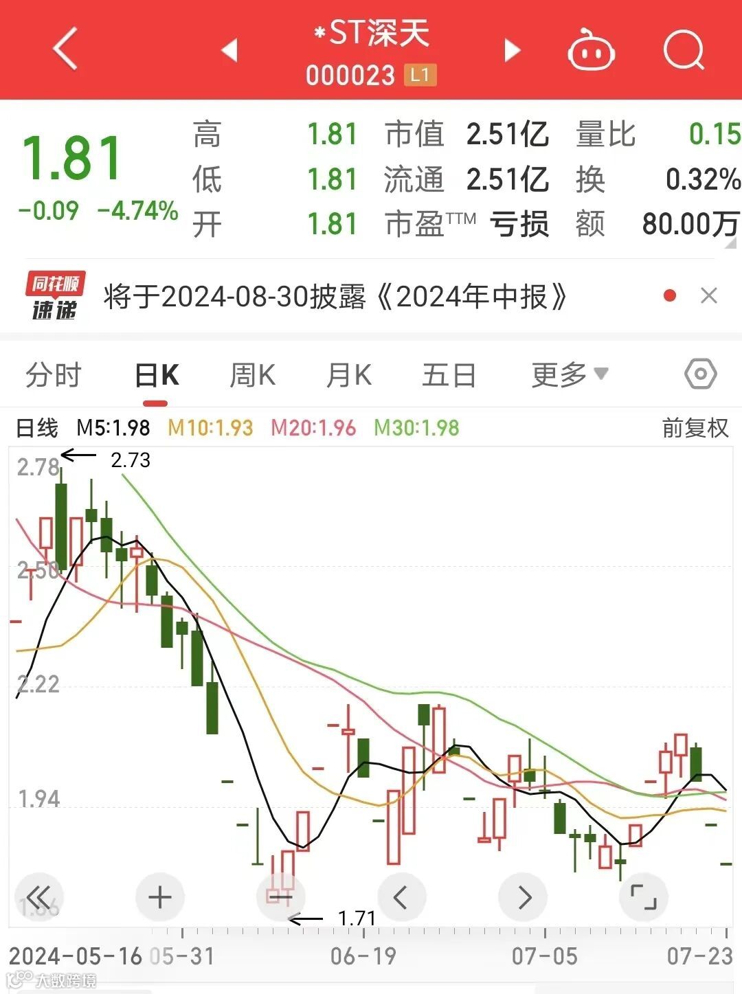 7月23日,*ST深天全天一字跌停,单日成交额仅80万元,公司股价报1.81元/股,对应市值约为2.51亿元。