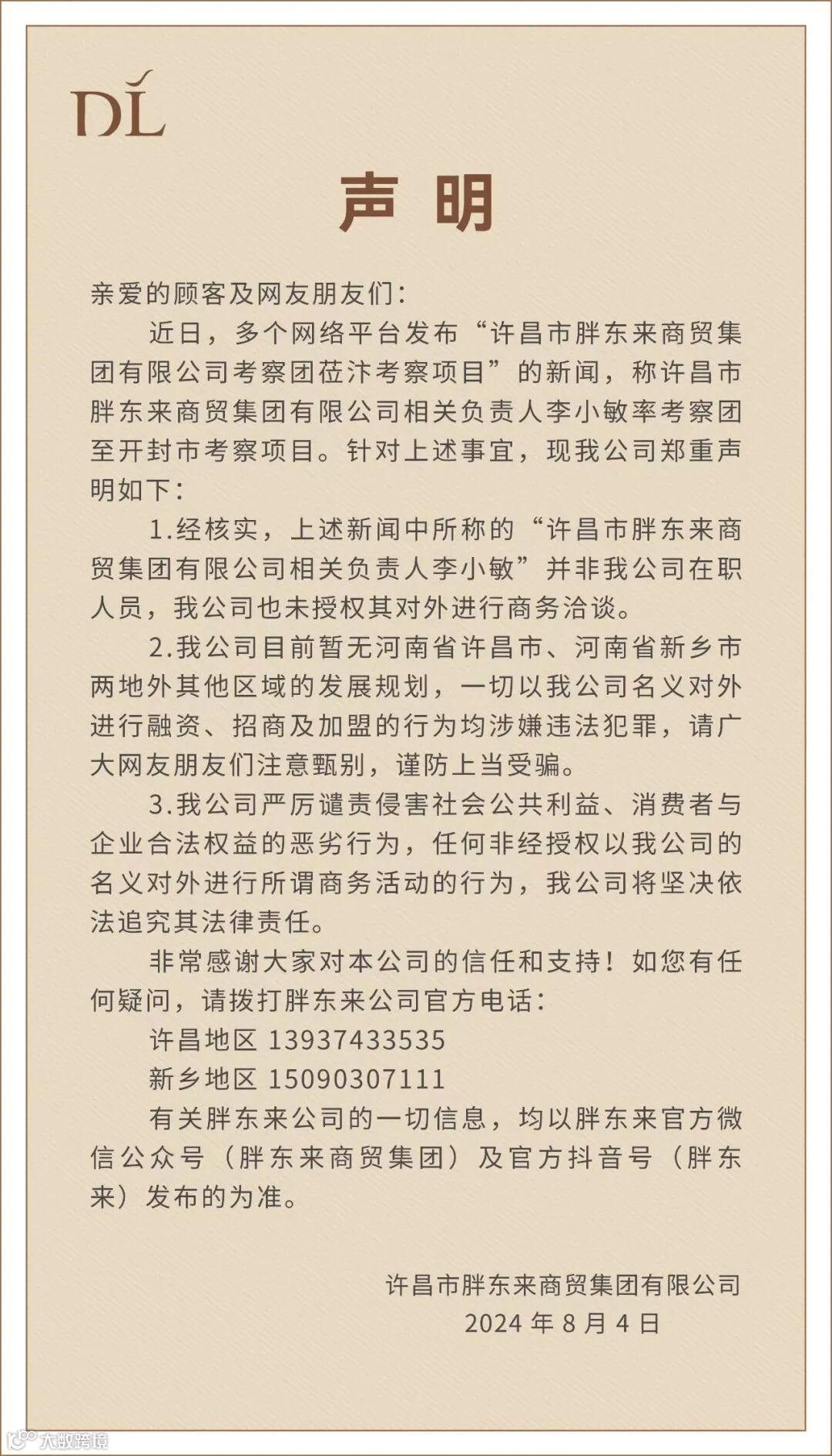 声明中,胖东来提出,公司目前暂无河南省许昌市、河南省新乡市两地外其他区域的发展规划,一切以公司名义对外进行融资、招商及加盟的行为均涉嫌违法犯罪,请广大网友朋友们注意甄别,谨防上当受骗。公司严厉谴责侵害社会公共利益、消费者与企业合法权益的恶劣行为,任何非经授权以公司的名义对外进行所谓商务活动的行为,公司将坚决依法追究其法律责任。有关胖东来公司的一切信息,均以胖东来官方微信公众号(胖东来商贸集团)及官方抖音号(胖东来)发布的为准。