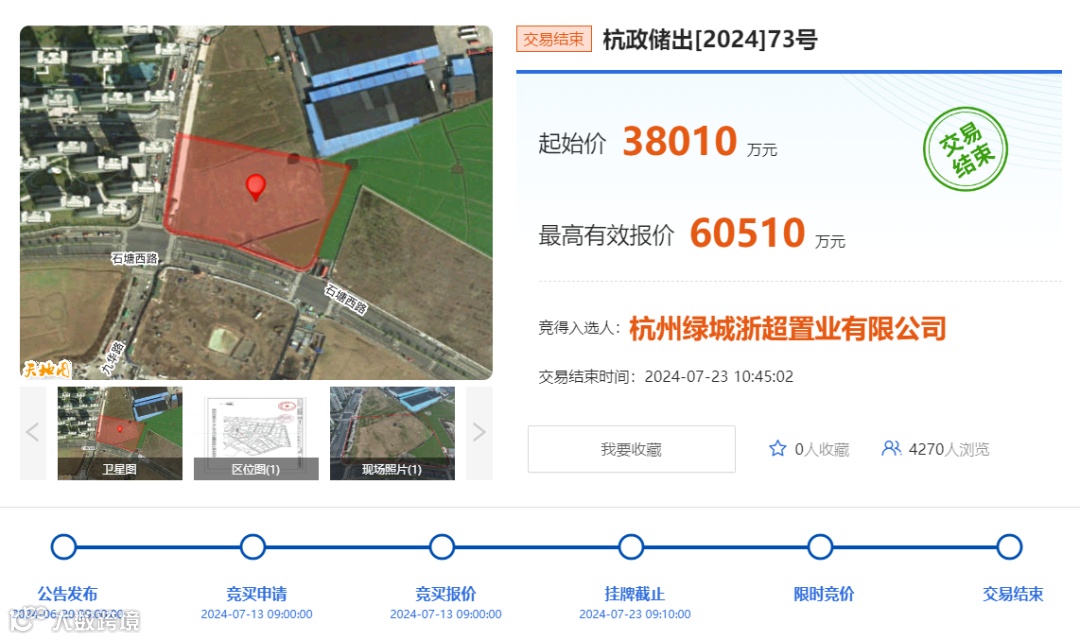 竞拍信息显示,经过46轮报价,由竞买人杭州绿城浙超置业有限公司以6.051亿元总价竞得,折算楼面价约22287元/平方米。